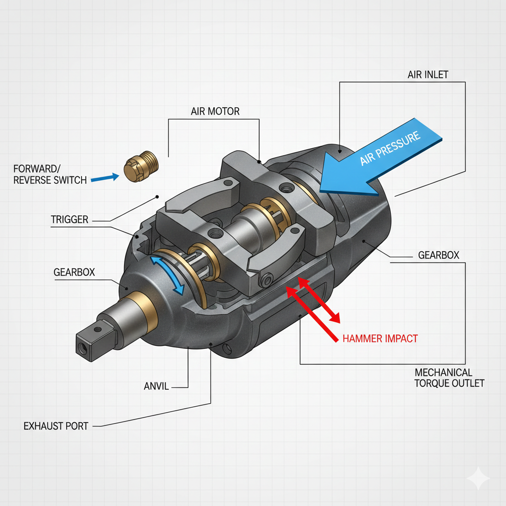قلب یک آچار ضربه ای پنوماتیک موتور هوا آن است. وقتی کاربر ماشه را میکشد، هوای فشرده وارد ابزار شده و روتور را میچرخاند. این روتور به یک "مکانیسم ضربه" متصل است - معمولاً یک طرح دوقلو چکش یا سگ گهواره ای. همانطور که روتور می چرخد، انرژی جنبشی ایجاد می کند. هنگامی که مقاومت پیچ از نیروی چرخش موتور بیشتر میشود، چکشهای داخلی به شفت خروجی (سندان) ضربه میزنند و یک انفجار ناگهانی و عظیم از نیروی چرخشی ایجاد میکنند. این صدها یا حتی هزاران بار در دقیقه اتفاق می افتد.